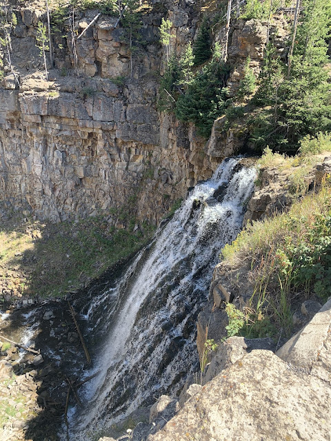 We left Driggs, this morning about 9:45am and headed for Yellowstone. The drive was easy and we were again intrigued by the miles and miles of green and yellow fields—potatoes, wheat and hay. Yellowstone was looming on our horizon. Yellowstone encompasses more than 2.2 million acres, most of it beyond the reach of roads. One could take an entire lifetime to experience the park and would still never see it all. We crossed from Idaho into Montana and into the park at West Yellowstone, Montana.